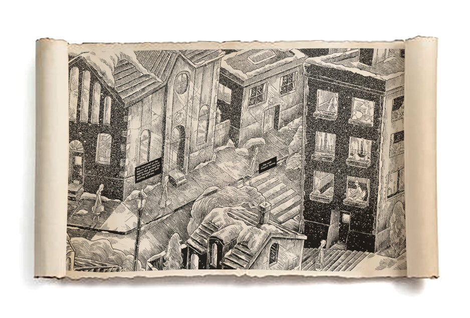 The narrative unfolds over 14 six-foot black and white drawings that encircle the gallery; each meticulously detailed paper scroll flowing into the next.